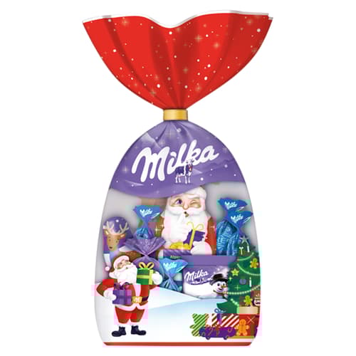 Balíček plný mléčné čokolády z alpského mléka a plněné mléčné čokolády z alpského mléka. Mléčná čokoláda obsahuje nejméně 30 % kakaové sušiny.
