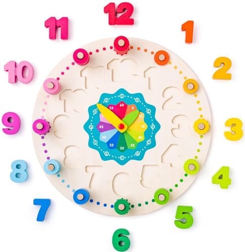 Barevná didaktická hračka pomáhá dětem pochopit pojem času a naučit se poznávat hodiny zábavnou formou. Díky pohyblivým ručičkám a barevným kroužkům s číslicemi si děti snadno osvojí vztah mezi čísly, časem a hodnotami, které představují. Hračka rozvíjí logické myšlení, koncentraci a jemnou motoriku, a zároveň podporuje vizuální vnímání barev a tvarů.