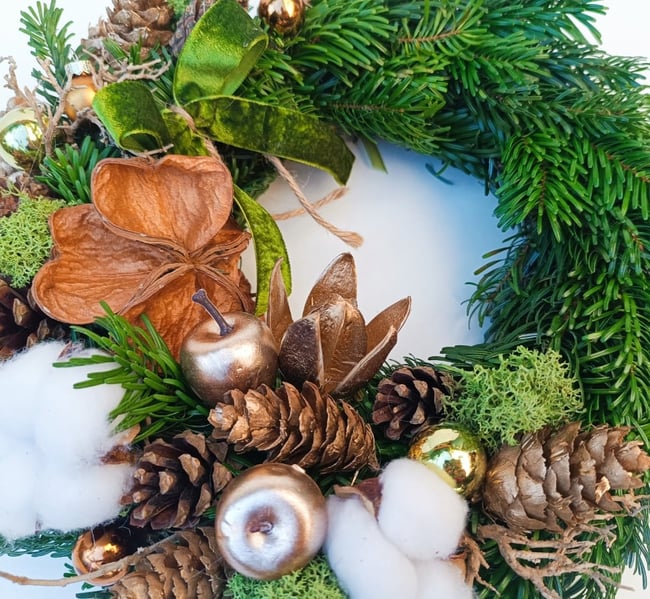 Ručně vyráběný věnec na dveře v tónech zlaté a zelené krásně podrthne atmosféru adventních dní.