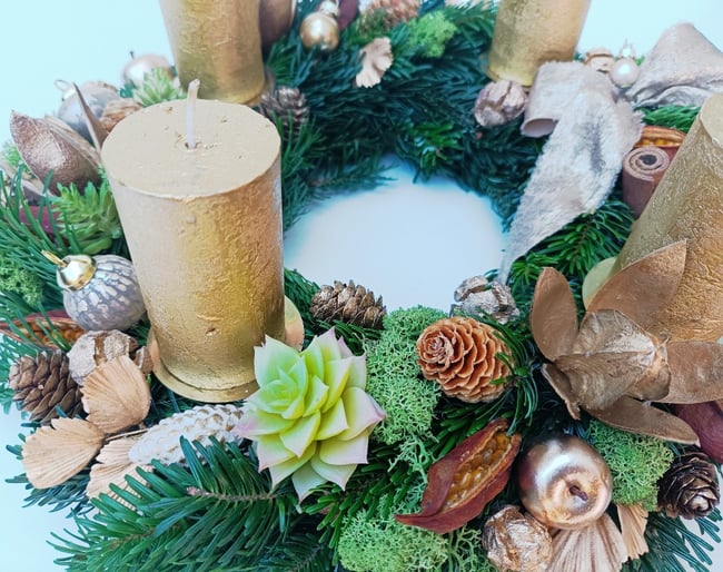 Ručně vyráběný velký adventní věnec v tónech zlaté krásně zútulní váš domov a podtrhne atmosféru adventních dní.