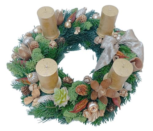 - slaměný korpus obalený jedlovou chvojí, skořice, šišky, barvené šišky, lišejník,stabilizovaný eukalyptus, přírodní a plastové dekorace, skleněné kouličky, stuha, plechové bodce pod svíčky, svíčky