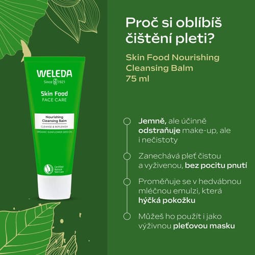 - Skin Food nourishing cleansing balm – účinně odstraňuje nečistoty a make-up. Krémový olejový balzám s výživným organickým slunečnicovým olejem a rostlinnými výtažky z violky, organického měsíčku a heřmánku jemně čistí pleť, zatímco ji zanechává hydratovanou. Balzám se při kontaktu s vodou rychle přemění v mléčnou emulzi a snadno se smývá.