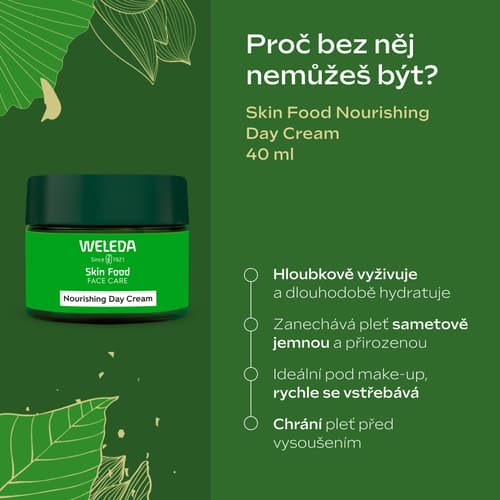 - Skin Food nourishing day cream – hloubkově vyživuje a hydratuje pokožku, zanechává ji sametově jemnou, rozjasněnou a přirozeně krásnou. Výživný krém v sobě spojuje rostlinné výtažky z violky, organického měsíčku, heřmánku a olivových listů. To vše je doplněno o rostlinný skvalan a organický slunečnicový olej.