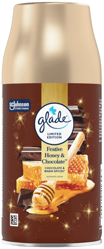 Glade Festive Honey & Chocolate náplň do elektrického difuzéru provoní váš domov sladkou kombinací medu a hořké čokolády, která vytváří hřejivou, sváteční atmosféru. Vůně se uvolňuje postupně a rovnoměrně, takže si ji můžete užívat celé týdny.