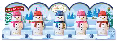 Lindt Mini sněhuláci jsou vyrobeni z alpské plnotučné mléčné čokolády. Přibližně 5 cm velké postavičky můžete použít i jako dekorace v období Vánoc nebo na barevném vánočním talíři. Díky perforaci a dírkám na kartonu se dají skvěle využít i jako dárkové visačky. Vyrobeno z těch nejlepších surovin mistry čokolatiéry již od roku 1845.