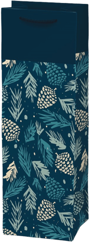 Papírová dárková taška s vánočním motivem modrých šišek je ideální pro zabalení lahví nebo vyšších dárků.
