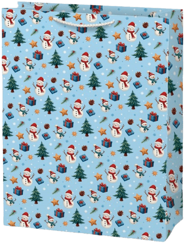 Velká papírová dárková taška s vánočním motivem stromků a sněhuláků je ideální pro balení větších dárků.