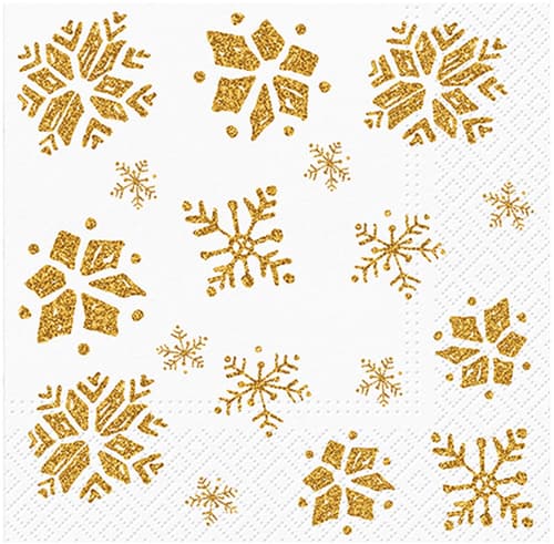 Elegantní bílé vánoční ubrousky s motivem zlatých sněhových vloček ze třívrstvého papíru. Stylový doplněk svátečního stolu, který dodá vašemu stolování zimní nádech.