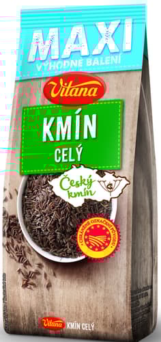 Kmín celý český v maxi balení. Jako Český kmín může být označen pouze dvouletý kmín, který je vyšlechtěný a vypěstovaný na území České republiky. Navíc musí obsahovat vysoký podíl silic a splňovat přísné požadavky na kvalitu a způsob pěstování. Právě díky vysokému obsahu silic má mnohem silnější, aromatičtější vůni a chuť.