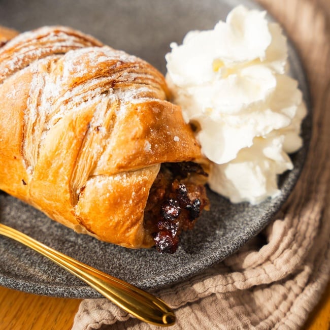 Jablečný miništrúdl od Zrno zrnko. Spousta jablek, skořice, rozinek a vlašských ořechů zavinutých do křupavého listového těsta. Klasika, kterou všichni milují a nikdy neomrzí.