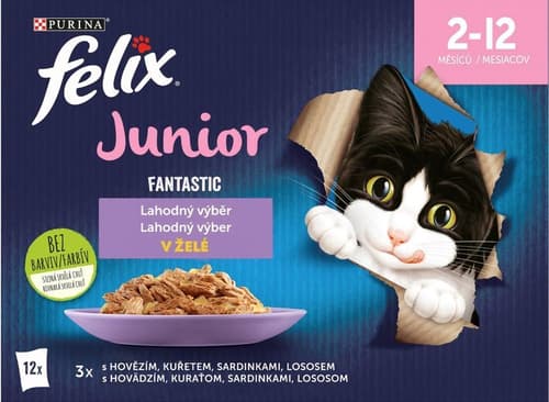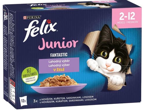 Felix Fantastic Junior Multipack hovězí, kuře, sardinky a losos v želé pro kočky 12×85 g