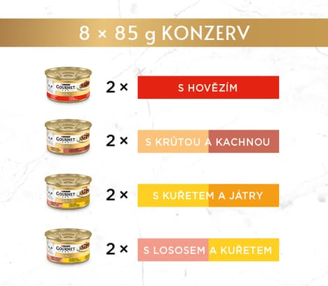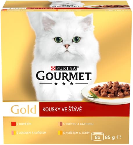 Kompletní krmivo pro dospělé kočky. Gourmet Gold vytvořil kousky ve šťávě, lahodné receptury, které budou každý den rozmazlovat mlsný jazýček vaší kočky novým chuťovým zážitkem. Jemné kousky s hovězím, kuřetem, lososem a dalšími vynikajícími příchutěmi, jemně povařené k dokonalosti a obklopené lahodnou šťávou, nabízí vaší kočce potěšení z báječné a plné chuti.