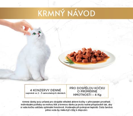 Krmný návod: Dospělou kočku o průměrné hmotnosti (4 kg) krmte čtyřmi konzervami denně, nejméně ve dvou samostatných dávkách. Krmné dávky jsou určené pro dospělé středně aktivní kočky v přirozeném prostředí. Individuální potřeby se mohou lišit a krmnou dávku je proto nutné přizpůsobit tak, aby si vaše kočka udržela optimální hmotnost.