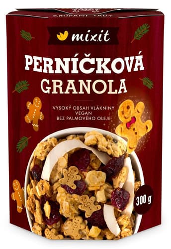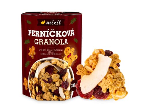 Perníčková granola – limitovaná zimní edice. Granola s výraznou perníkovou chutí a vůní. Obsahuje křupavé kokosové chipsy, sušená jablka, šťavnaté brusinky a velké kousky kořeněných perníčků s bohatou dávkou perníkového koření. Vhodná jako snídaňová směs nebo zimní svačina s atmosférou domácího cukroví.