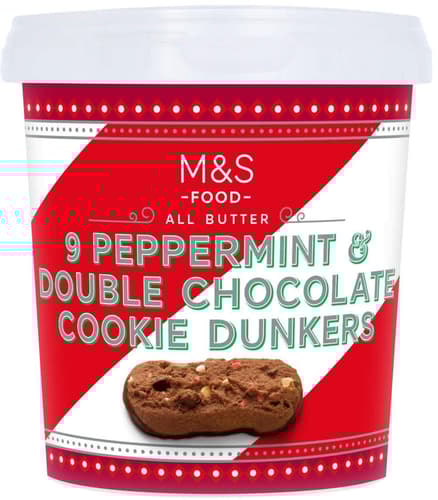 Křehké sušenky Marks & Spencer vyrobené z máslového těsta jsou z poloviny máčené v tmavé čokoládě a obsahují kousky hořké i bílé čokolády spolu s osvěžujícím nádechem máty.