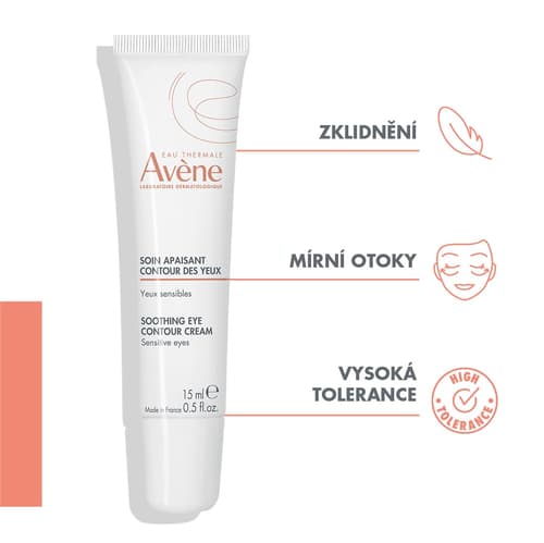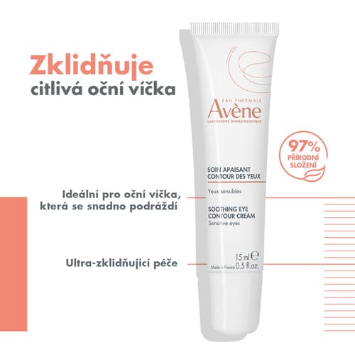 Avene Zklidňující péče o oční okolí zmírňuje otoky citlivých očních víček, hydratuje a poskytuje uklidňující pocit lehkosti. Její složení obohacené o bisabolol, dextran sulfát a olej ze semen světlice barvířské posiluje kožní bariéru, okamžitě zmírňuje pocit napětí a redukuje cévní a pigmentové kruhy pod očima, čímž dodává pleti uvolněnější a zářivější vzhled. Zklidňující péče o okolí očí je bohatá na termální vodu Avène a zmírňuje podráždění. Bez parfemace. Benefity: Okamžitě zmírňuje pocit pnutí*. Zmírňuje tmavé kruhy pod očima. Hydratuje a zklidňuje oblast kolem očí**. *Klinické hodnocení, 33 osob, 2 aplikace denně po dobu 28 dnů. **Kinetika hydratace u 31 osob po jedné aplikaci. Pokožka v okolí očí: 4x méně podrážděná za 21 dní. Vyživená po dobu 48 hodin. Hydratovaná po dobu 8 hodin. Balení obsahuje 15 ml.