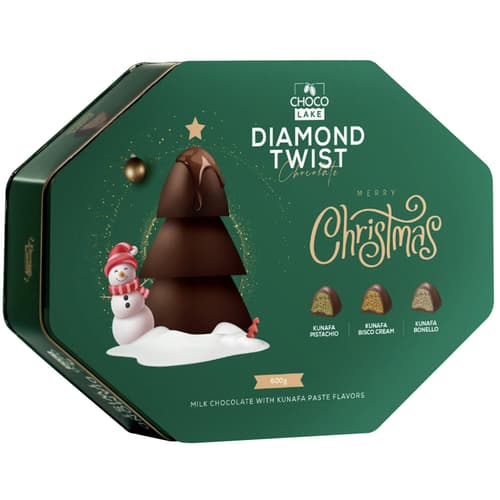 Prémiová čokoládová specialita Choco Lake Diamond Twist v luxusním balení. Jemná mléčná čokoláda v kombinaci s kunafa pastou vytváří nezapomenutelný chuťový zážitek inspirovaný orientálními dezerty.
