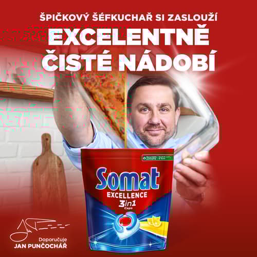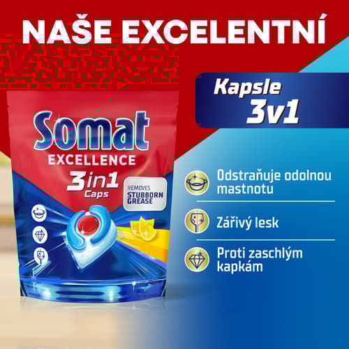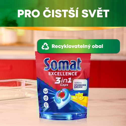 Kapsle na nádobí Somat 3v1 Lemon pro dokonalé čištění, zářivý lesk a proti zaschlým stopám po vodě. Rychle se rozpouštějící prémiové kapsle kombinují práškový mycí prostředek a 3 pevné gelové komory v biologicky odbouratelné a ve vodě 100% rozpustné fólii. Kapsle Somat jsou vhodné pro všechny talíře, sklenice, hrnky, láhve, hrnce, plasty a pánve, které lze mýt v myčce.