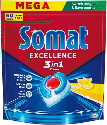 Kapsle na nádobí Somat 3v1 Lemon pro dokonalé čištění, zářivý lesk a proti zaschlým stopám po vodě. Rychle se rozpouštějící prémiové kapsle kombinují práškový mycí prostředek a 3 pevné gelové komory v biologicky odbouratelné a ve vodě 100% rozpustné fólii. Kapsle Somat jsou vhodné pro všechny talíře, sklenice, hrnky, láhve, hrnce, plasty a pánve, které lze mýt v myčce.