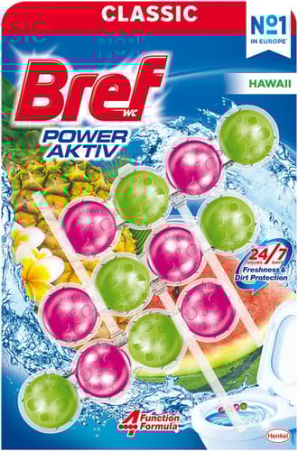 Bref Power Aktiv je pevný WC blok s exotickými a ovocnými tóny v atraktivním balení čtyř kuliček, které v sobě ukrývají recepturu se čtyřmi funkcemi funkcemi.