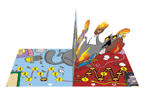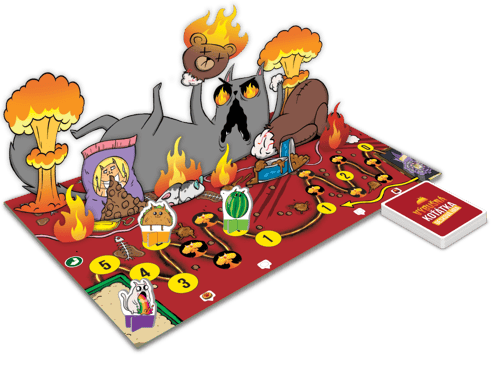 Exploding Kittens Výbušná koťátka: hrajte karty, posouvejte se dopředu a buďte první, kdo se dostane do cíle. Ve hře se pohybujete pomocí karet, kterých je několik druhů. Některé akční karty a karty pohybu říkají „Překlop herní plán“ – když k tomu dojde, herní plán se překlopí z „klidového režimu“ do „chaotického režimu“. Nastražte pasti, přechytračte své protivníky a snažte se nevybuchnout. Pokud náhodou vybuchnete, neznamená to, že ve hře končíte, ale musíte si prohodit místo s aktuálně posledním hráčem.