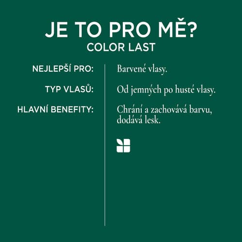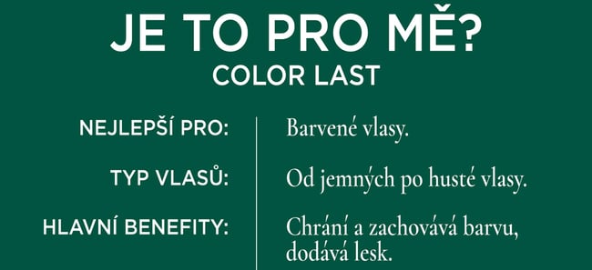Balzám Color Last obnovuje a prodlužuje zářivost barvy vlasů tak, jako v den barvení. Jeho formule s nízkým pH pomáhá uzamykat pigment uvnitř vlasového vlákna, čímž zabraňuje blednutí barvy. Vlasy zanechává hladké, lesklé a poddajné, s výrazně snadnějším rozčesáváním.