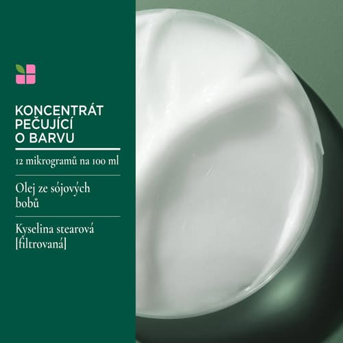 Obsahuje mikrodávky koncentrátu s olejem ze sójových bobů a kyselinou stearovou, přesně kalibrované pro optimální rovnováhu výživy, ochrany a lesku. Výsledkem jsou hedvábně hebké vlasy s dlouhotrvající sytou barvou a přirozeným leskem.