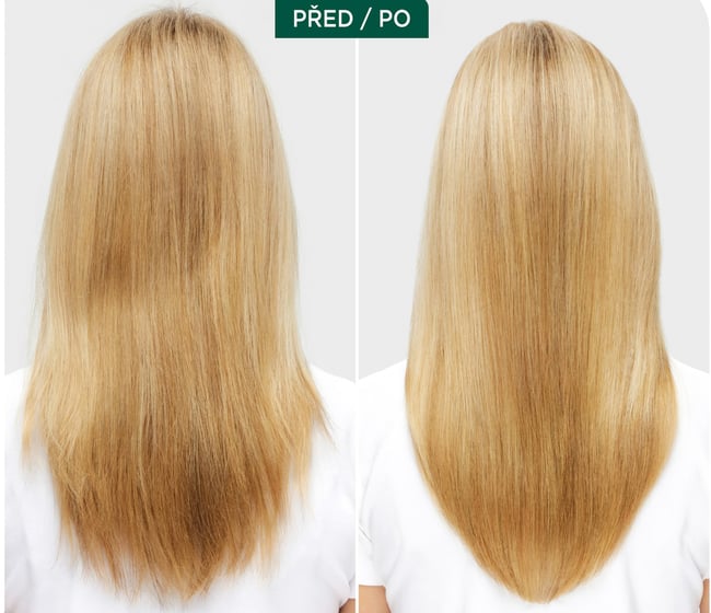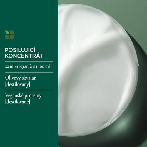 Je obohacený o mikrodávky posilujícího koncentrátu s olivovým skvalanem a veganskými proteiny, přesně kalibrovanými pro cílenou obnovu a hydrataci. Tato kombinace pomáhá uzamykat vláhu, posiluje strukturu vlasu a navrací mu přirozenou pružnost i vitalitu.