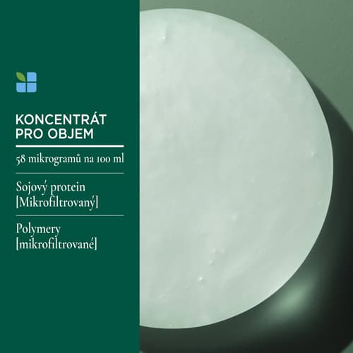Je obohacený o mikrodávky koncentrátu mikrofiltrovaného sójového proteinu a objemových polymerů, které vlasům dodávají viditelný objem bez kompromisu v hebkosti nebo hydrataci.