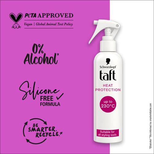 Termoochranný sprej na vlasy Taft poskytuje spolehlivou ochranu před teplem až do 230 °C, čímž pomáhá předcházet poškození a vysušování vlasů při fénování, žehlení i kulmování.