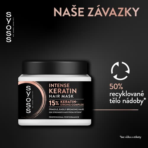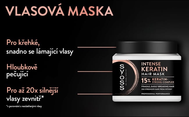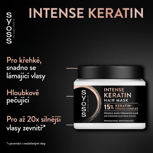 Keratinová vlasová maska Syoss Intense poskytuje intenzivní péči pro křehké a snadno se lámající vlasy, které potřebují hloubkovou regeneraci a posílení.