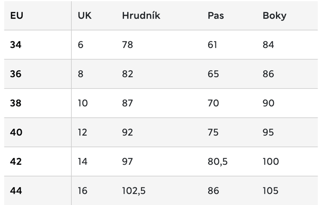 - velikost 12 odpovídá české velikosti 40 (obvod hrudníku 92 cm, pasu 75 cm, boků 95 cm)