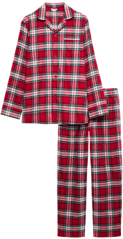 Měkký flanelový materiál s typickým červeno-bílým kostkovaným vzorem zahřeje během chladných večerů, zatímco volný střih a stahovací šňůrka v pase zaručí pohodlné nošení. Košilový horní díl s knoflíky dodává pyžamu elegantní vzhled, který se neomrzí – ideální pro domácí pohodu i sváteční rána.