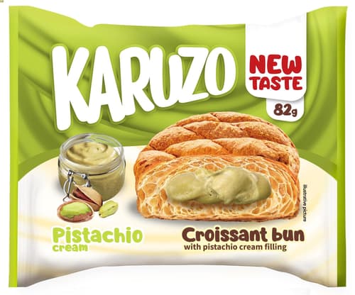 PŠENIČNÁ mouka, PISTÁCIOVÁ náplň 30 % (cukr, glukózový sirup, palmový tuk, stabilizátor: glycerol; modifikovaný kukuřičný škrob, sušená sladká SYROVÁTKA, PISTÁCIOVÁ pasta 2 %, regulátor kyselosti: síran vápenatý; jedlá sůl, barvivo: měďnaté komplexy chlorofylů a chlorofylinů; konzervační látka: sorban draselný; kyselina: glukono-delta-lakton; přírodní aroma), rostlinné tuky: palmový, slunečnicový; cukr, glukózový sirup, droždí, emulgátory: mono- a diglyceridy mastných kyselin, stearoyl-2-laktylát sodný, estery mono- a diglyceridů mastných kyselin s kyselinou mono- a diacetylvinnou; jedlá sůl, aromata, regulátor kyselosti: kyselina citronová; konzervanty: propionát vápenatý, kyselina sorbová; barvivo: beta-karoten