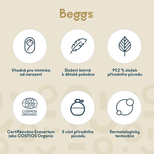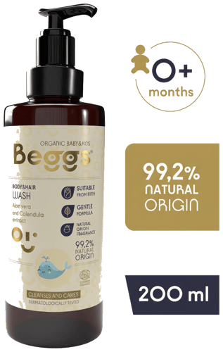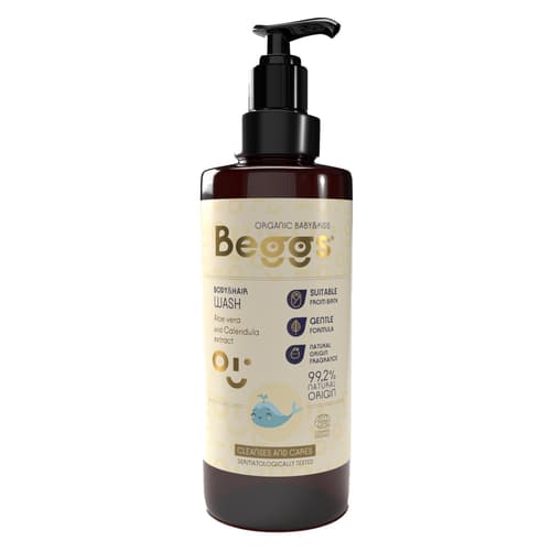 Beggs dětský sprchový gel na tělo i vlasy je šetrný nejen k citlivé pokožce Vašeho děťátka, ale i k jeho jemným vláskům. Obsahuje aloe vera šťávu, která podporuje hydrataci pokožky, vyživuje ji a chrání. Dále obsahuje extrakt z květu měsíčku lékařského, který má zjemňující a zvláčňující účinky.