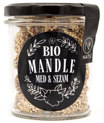 Výběrové BIO mandle ze Španělska jsou obalené v tenké medové krustě a posypané sezamovými semínky, které podtrhují jejich jemně nasládlou chuť. Mandle se praží na sucho i se slupkou. Výsledkem je harmonické spojení křupavosti, oříškové chuti a přírodního medového aroma.
