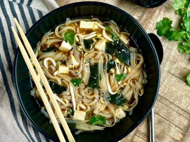 Bílé tofu 29 % (SÓJOVÉ boby, pitná voda, přírodní srážedlo nigari), rýžové nudle 23 % (rýžová mouka, tapiokový škrob, cukr, jedlá sůl), miso pasta 12 % (SÓJOVÉ boby, rýže, pitná voda, jedlá sůl), pikantní omáčka (chilli papričky 61 %, česnek, jedlá sůl, cukr, pitná voda, zvýrazňovače chuti: kyselina octová, glutaman sodný; regulátory kyselosti: kyselina citronová; zahušťovadlo: xanthanová guma; konzervant: sorban draselný), směs olejů (SÓJOVÝ olej, SEZAMOVÝ olej v různých poměrech), řasy wakame, koriandr, jarní cibulka, SÓJOVÉ klíčky, SEZAM