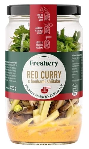 Směs na polévku značky Freshery. Vydejte se na cestu do Asie s krémovou polévkou s červeným kari, houbami shiitake a kokosovým mlékem. V chuti je intenzivní a lehce pikantní. Polévka je balena ve sklenici.