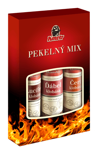 Dárkový pekelný mix od Kmotra. Obsahuje 3 druhy klobás z vepřového masa: