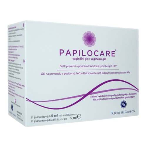 Zdravotnický prostředek. Papilocare vaginální gel na obnovu epitelu přechodové zóny děložního hrdla pro prevenci a podporu eliminace lézí způsobených HPV. Podporuje proces hojení, pokud je gel používaný jako podpůrný prostředek během léčby intraepiteliálních lézí způsobených HPV na sliznici děložního hrdla a pochvy. Tvoří ochranou bariéru v oblasti přechodové zóny děložního hrdla pro prevenci rizika napadení HPV. Neparfémovaný, pH=5. Balení obsahuje 21 jednorázových 5 ml tub s aplikátorem.