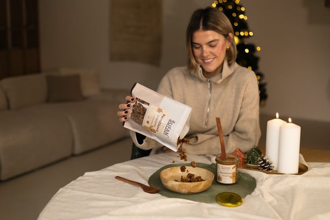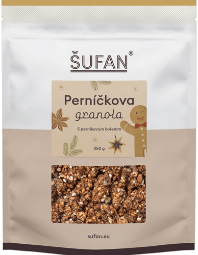 Perníčkova granola od značky Šufan je směsí bezlepkových vloček, pražených mandlí, ořechového másla, pomerančové kůry, vanilky z Ugandy a perníkového koření. Díky kokosovému cukru a medu je přirozeně sladká, křupavá a voňavá po skořici, hřebíčku a badyánu. Granola je vyráběna s důrazem na kvalitu a jednoduché složení.