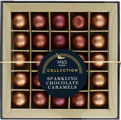 Pralinky od značky Marks & Spencer jsou vyrobeny z jemné belgické čokolády a obsahují různé náplně. Kombinace hořké a mléčné čokolády je doplněna třpytivou cukrářskou ozdobou. Tyto pralinky jsou baleny v elegantní krabičce, což je činí vhodným dárkem pro různé příležitosti. Produkt neobsahuje alkohol.