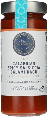 Rajčatová omáčka Marks & Spencer je pomalu vařená v malých dávkách, což zaručuje její vysokou kvalitu. Obsahuje kalábrijskou vepřovou klobásu, chilli papričky a kapku Chianti, které dodávají omáčce střední pikantnost. Omáčka je ideální pro přípravu těstovinových pokrmů nebo jako základ pro další recepty. Obsah alkoholu je 12 % obj.