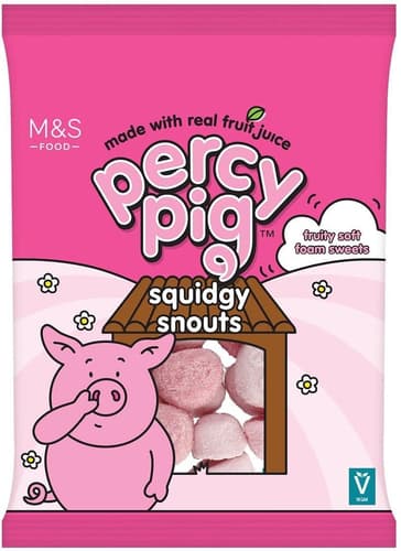 Marks & Spencer Percy Pig jsou měkké ovocné žvýkací bonbóny s jablečnou šťávou z koncentrátu. Bonbóny mají jemnou pěnovou texturu a tvar čumáčku Percyho, což je charakteristické pro tuto řadu. Jsou vhodné pro vegany a vyrobené z pravé ovocné šťávy, což zajišťuje jejich autentickou ovocnou chuť.