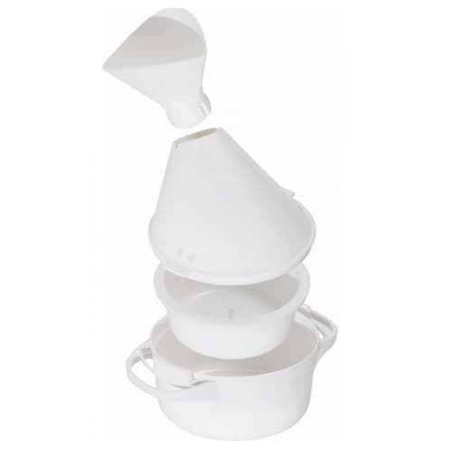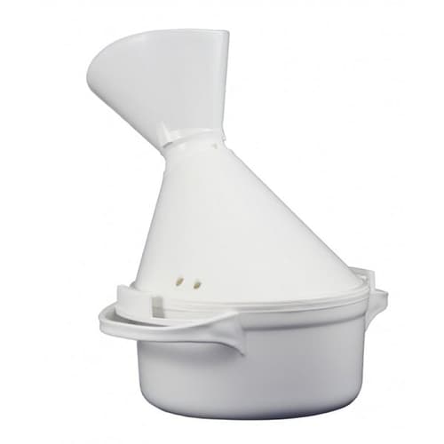 Parní inhalátor se používá při onemocnění dýchacích cest. Skládá se ze 4 dílů. Předností inhalátoru je dvojitá stěna spodní nádoby - ve spodním dílu je umístěna vyjímatelná nádoba na horkou vodu. Součástí horního anatomického nástavce je odnímatelný náustek, který je pohyblivý a jednoduše se přizpůsobí poloze při inhalaci. Inhalátor má dva ergonomicky tvarované úchyty pro snadnější manipulaci. Pomocí inhalace se dostanou léčivé látky až hluboko do dýchacích cest. Inhalovat můžeme minerální nebo slanou vodu, éterické oleje, bylinky nebo předepsané léky. Záleží na obtížích. Inhalovat se doporučuje i preventivně, například fyziologický roztok nebo Vincentku. Pravidelná inhalace posiluje odolnost dýchacích cest. Čistí a zvlhčuje sliznice. Sliznice jsou odolnější proti choroboplodným zárodkům, částicím prachu, alergenům. Rozměr inhalátoru: 23 x 14 cm. Objem vnitřní nádoby je 300 ml, inhalátor je vyroben ze zdravotně nezávadného plastu.