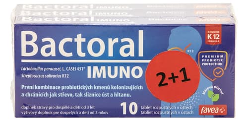 Doplněk stravy. Bactoral Imuno je doplněk stravy obsahují kombinaci dobře zdokumentovaných probiotických kmenů kolonizujících jak střevo (L. paracasei, L. CASEI 431®), tak sliznice úst a hltanu (S. salivarius K12®). Kdy užívat Bactoral Imuno? Při užívání antibiotik, před začátkem zimní sezóny a v průběhu zimy (říjen-březen), při sportu, pro doplnění mikrobioty. Benefity: Tablety s mátovou příchutí. a rozpustné v ústech. Vhodné pro děti od 3 let a dospělé. Nepřekračujte doporučené denní dávkování. Uchovávejte mimo dosah dětí. Doplňky stravy nejsou náhradou pestré a vyvážené stravy. Balení obsahuje 3x10 tablet. Hmotnost obsahu: 3x 8,1 g.