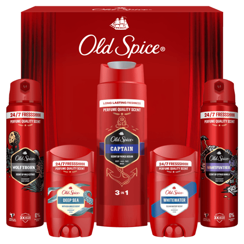 Dárková sada Old Spice Discovery Box obsahuje tuhé deodoranty Whitewater a Deep Sea, tělové spreje Night Panther a Wolfthorn a sprchový gel Captain. Vše je baleno v prémiové krabičce, která je ideální jako dárek. Sada nabízí pět vůní s dlouhotrvajícím efektem, které jsou navrženy pro moderního muže.
