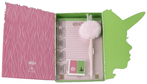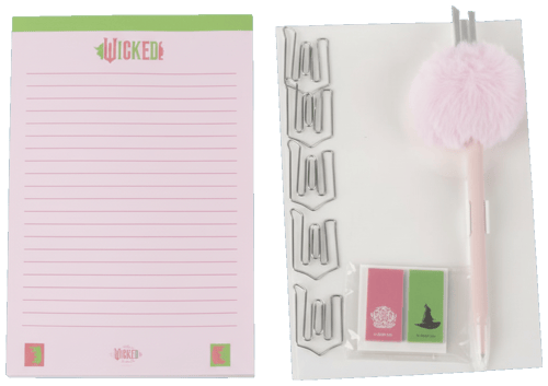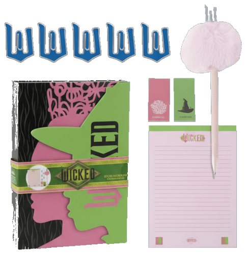 Stylový set pro všechny fanoušky Wicked. Obsahuje desky na sešity v designu Wicked, sešit, kuličkové pero, lepící papírky a sponky na papír – vše laděné do jednotného motivu. Kvalitní zpracování a výrazný design dělají z této sady skvělý dárek pro každého, kdo má rád originální doplňky. Dodáváno v elegantní dárkové krabičce.