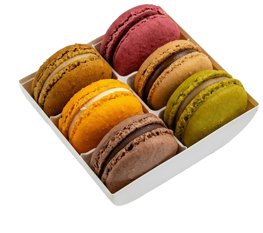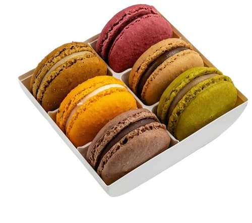 Každá krabička obsahuje 6 kusů makronek různých příchutí: