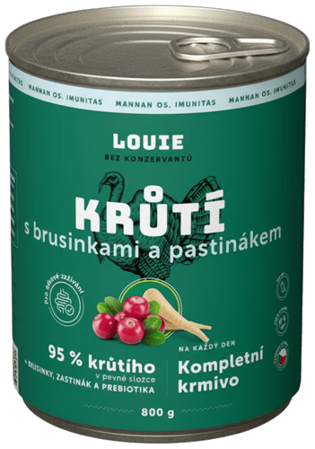 Louie konzerva pro psy obsahuje krůtí maso, brusinky, pastiňák a prebiotika, které podporují zdravé trávení. Je vhodná jako kompletní krmivo nebo doplněk k běžné stravě.
